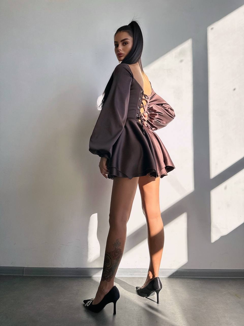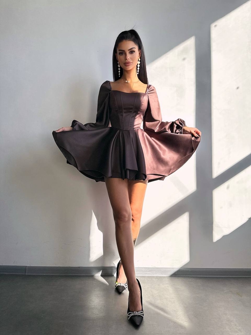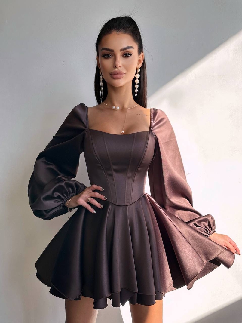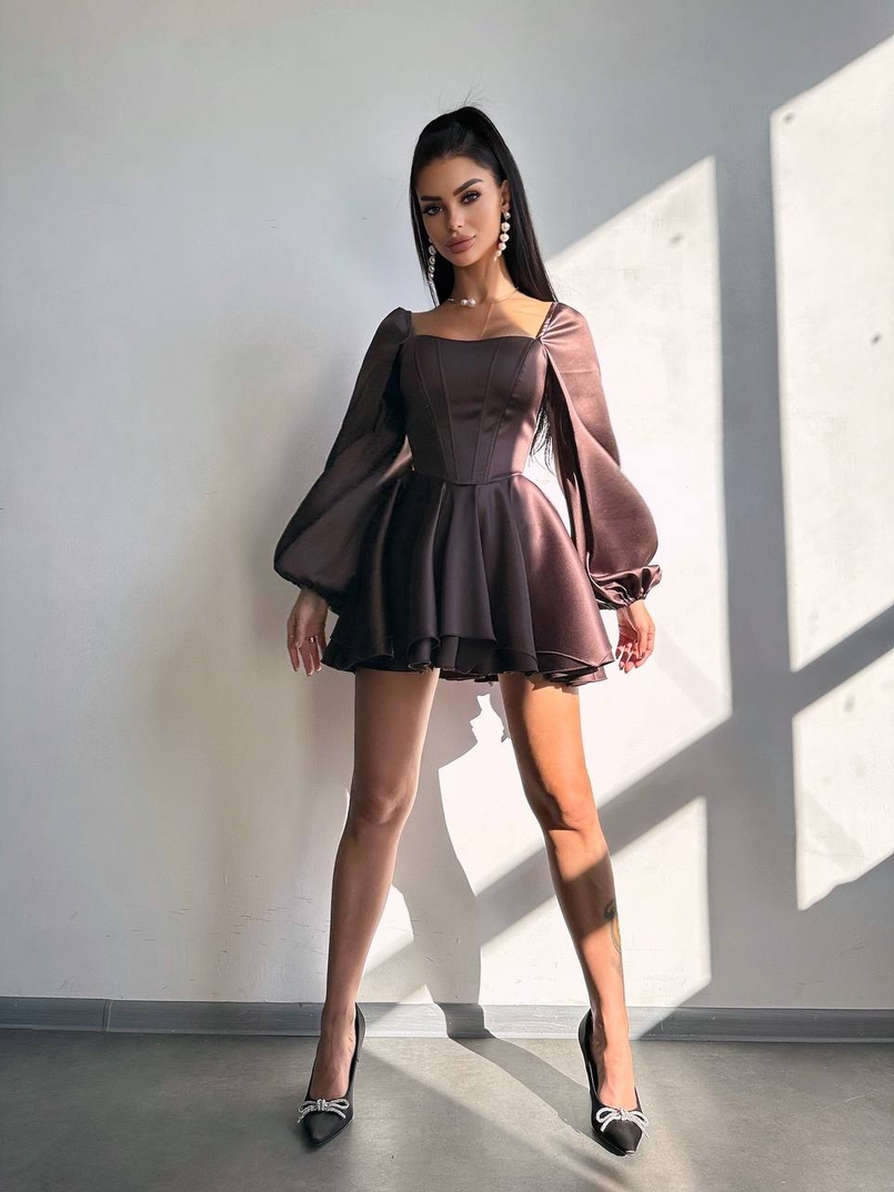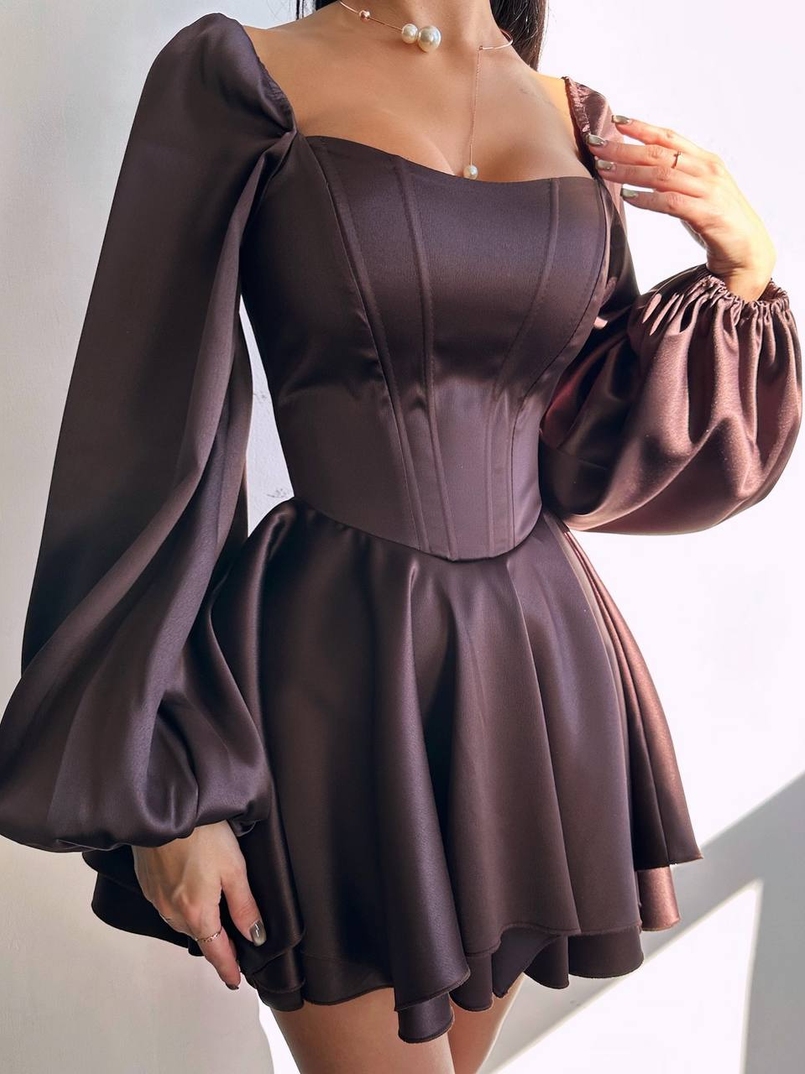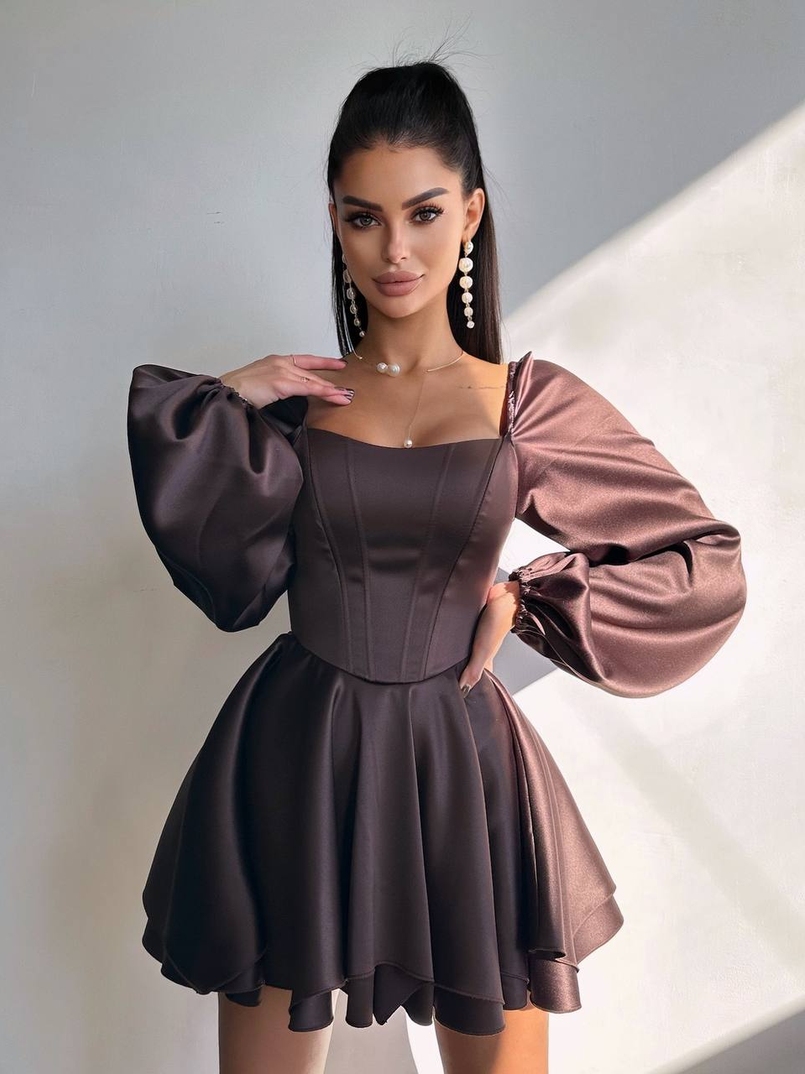 Атласна корсетна сукня з пишною подвійною спідницею та об‘ємними рукавами