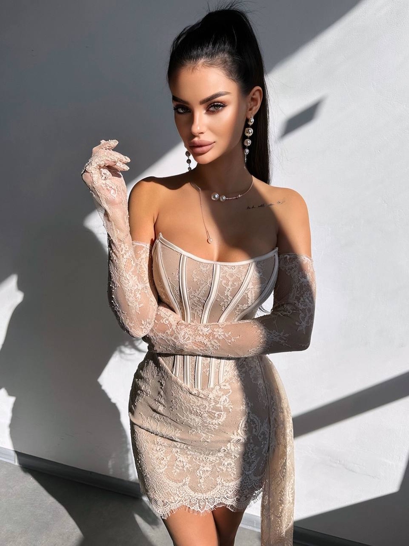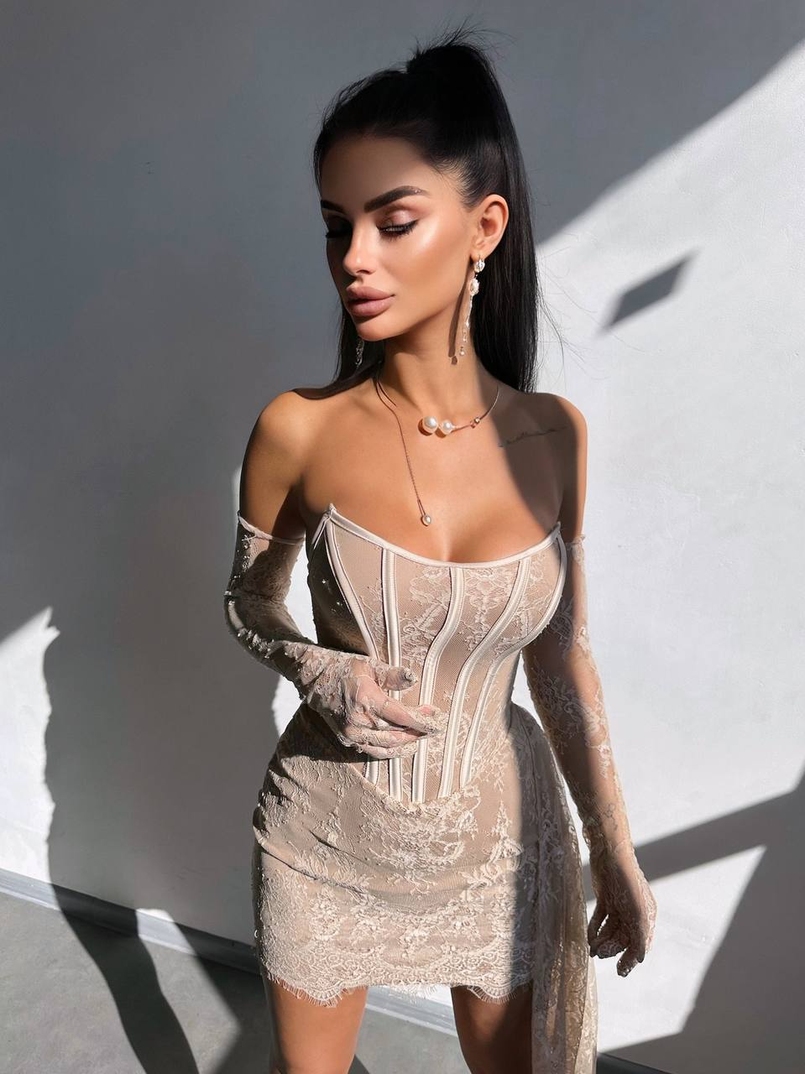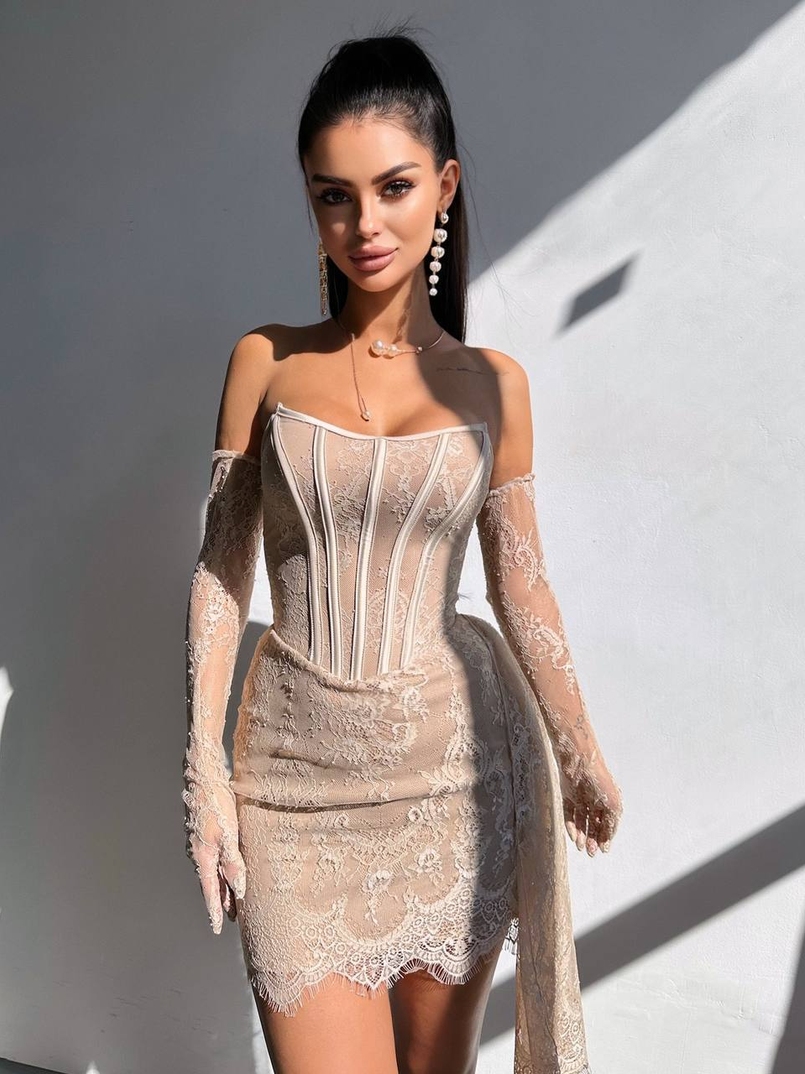 Сукня міні зі шлейфом та рукавичками