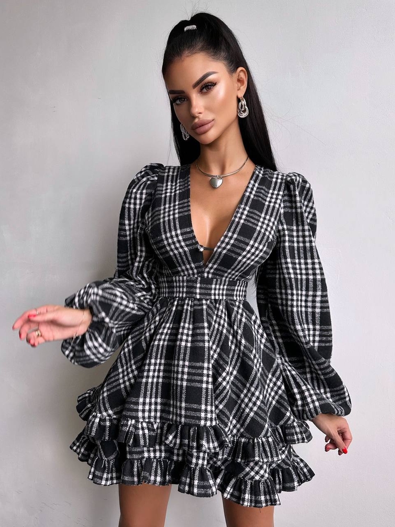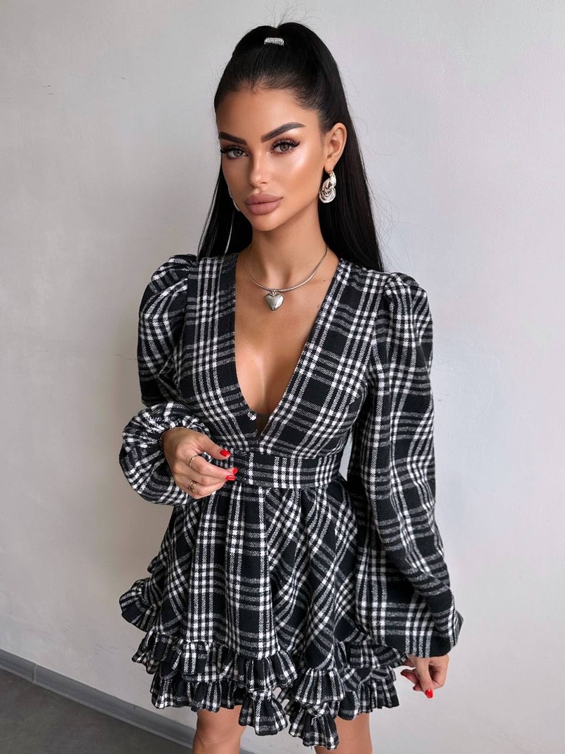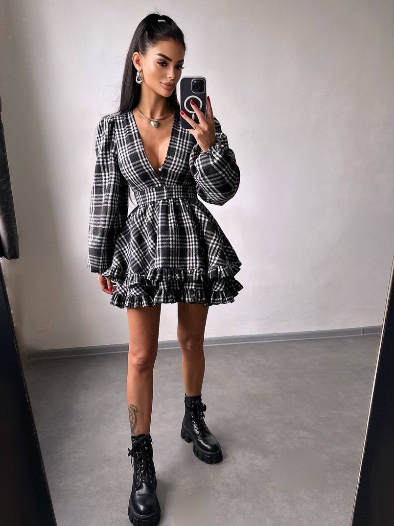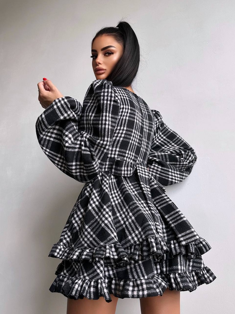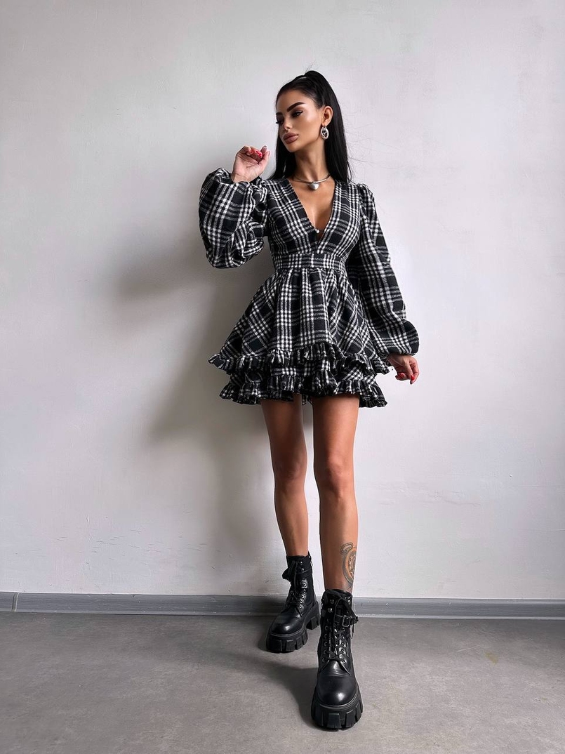 Сукня з подвійною спідницею та обʼємними рукавами у клітинку