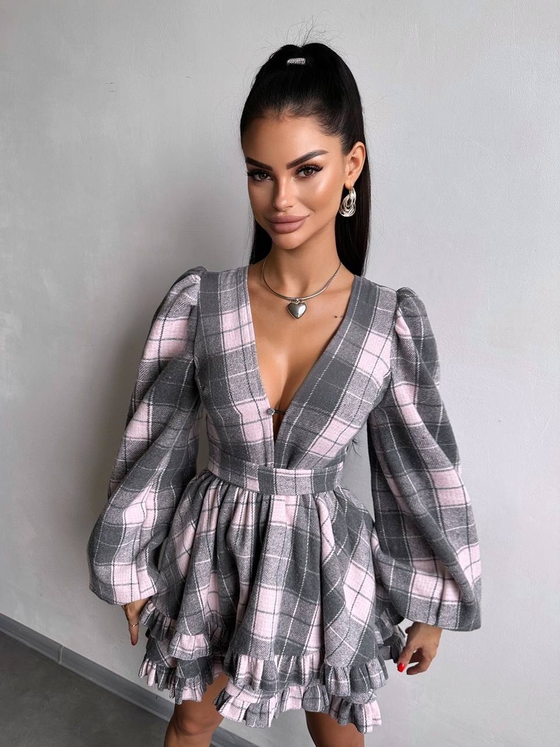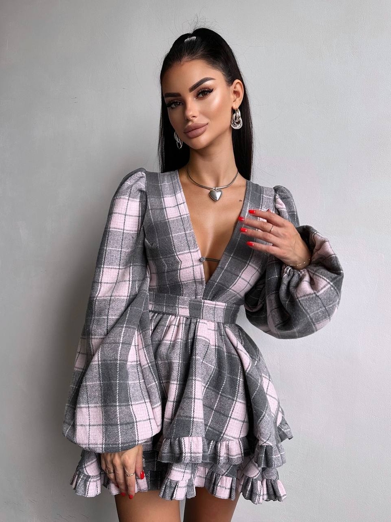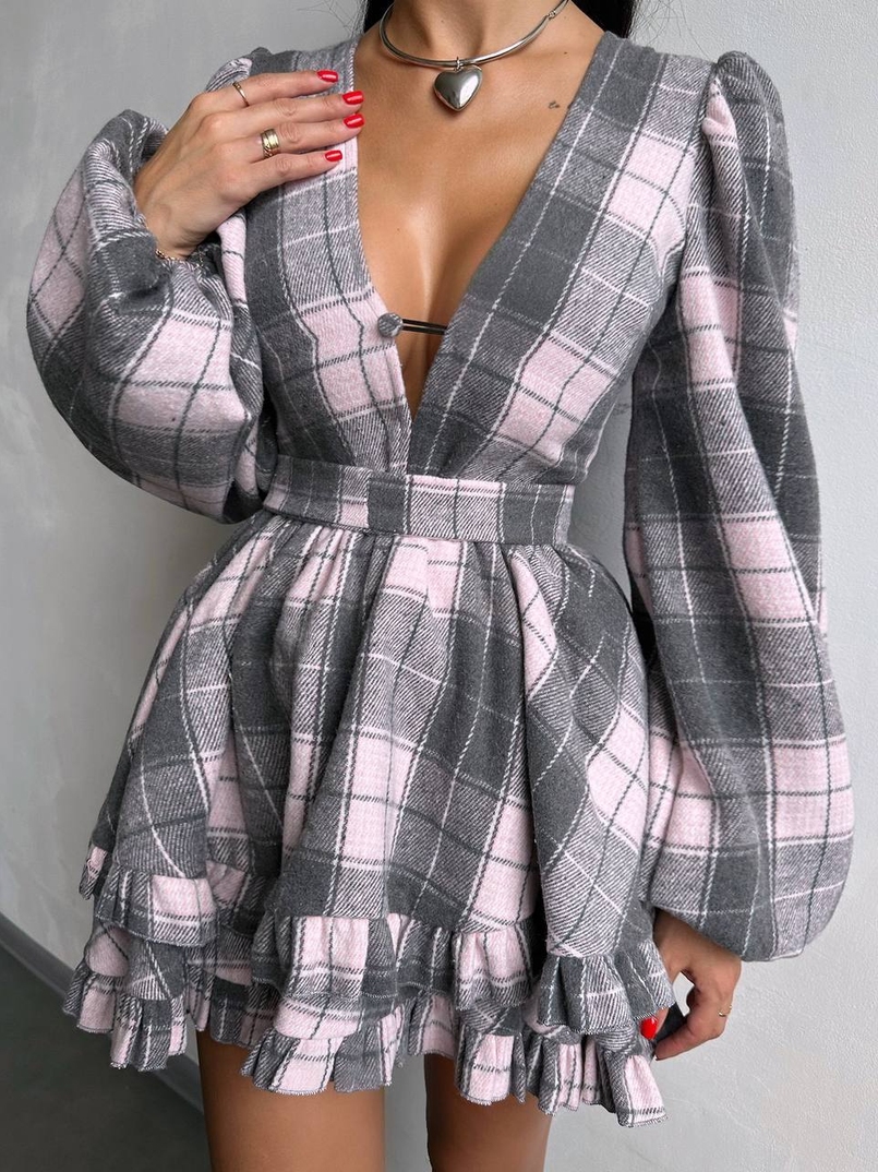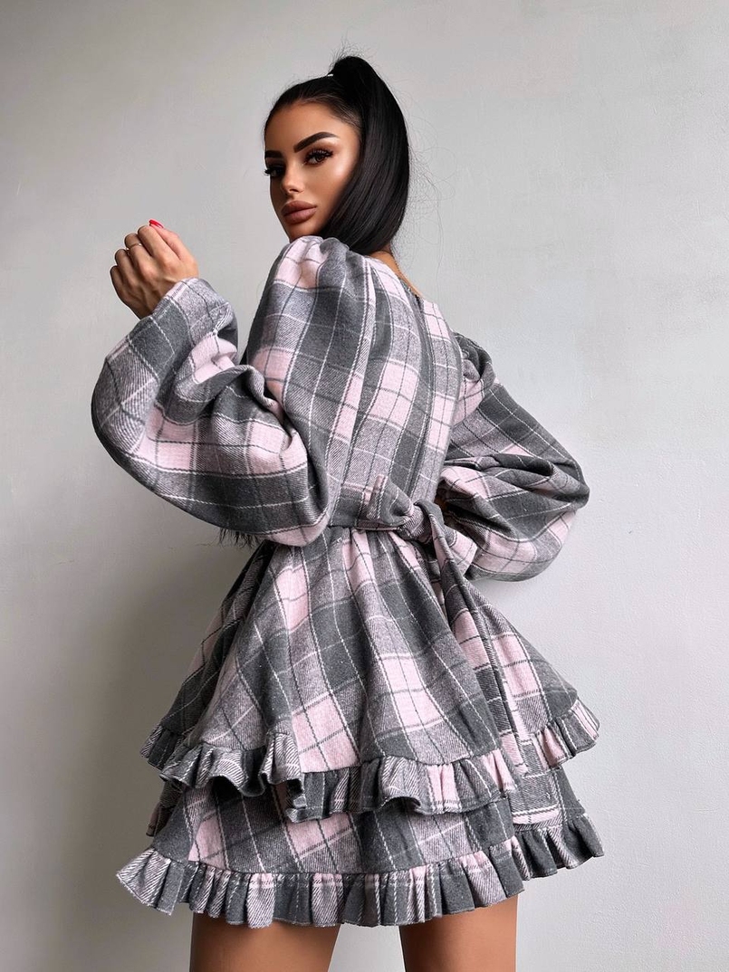 Сукня з подвійною спідницею та обʼємними рукавами у клітинку