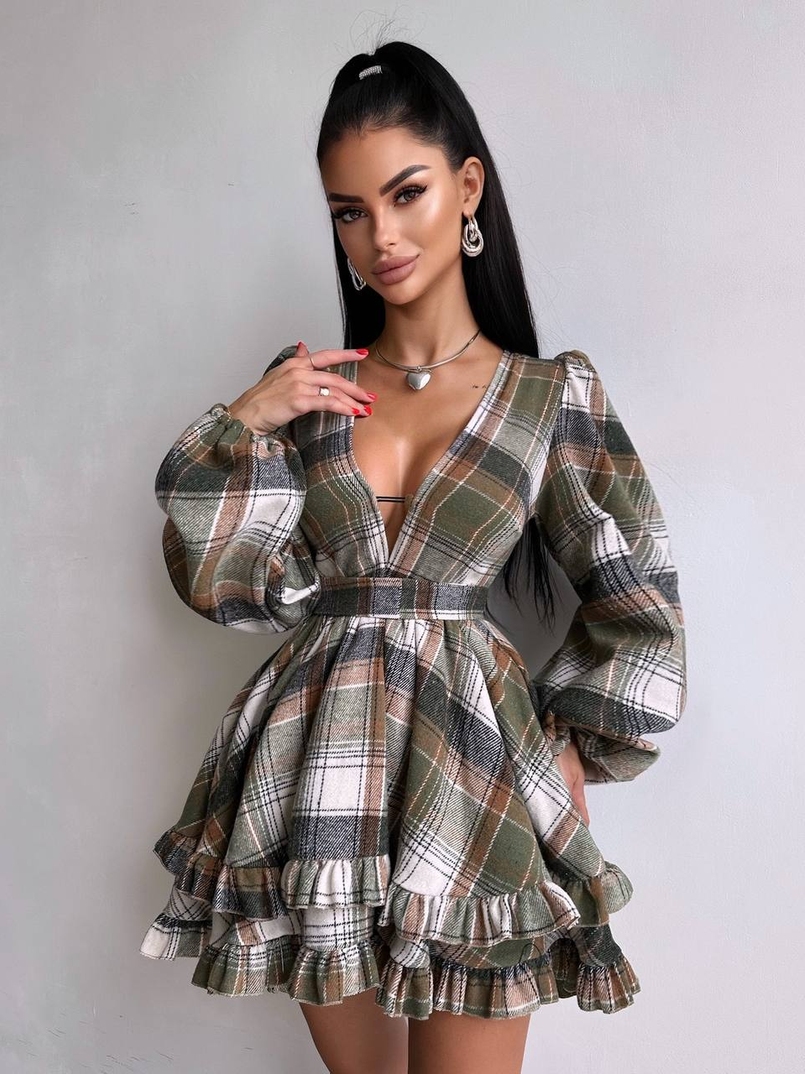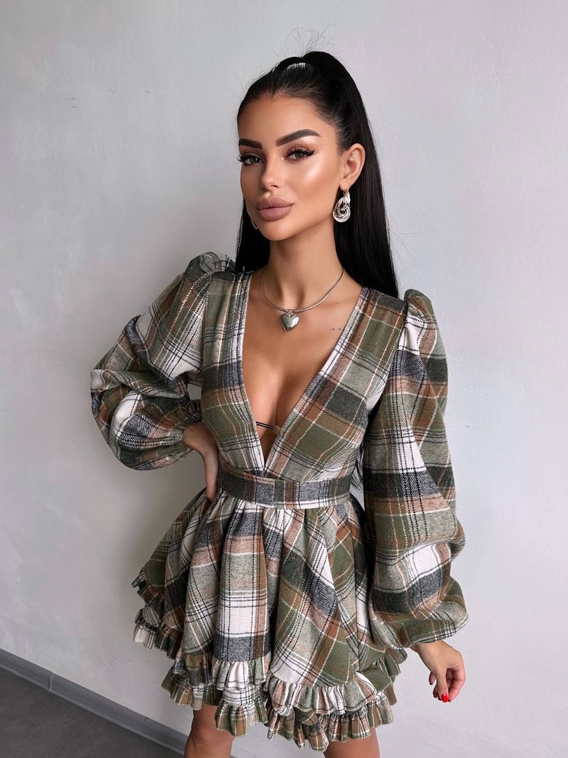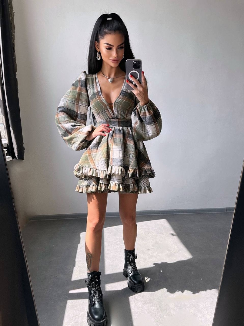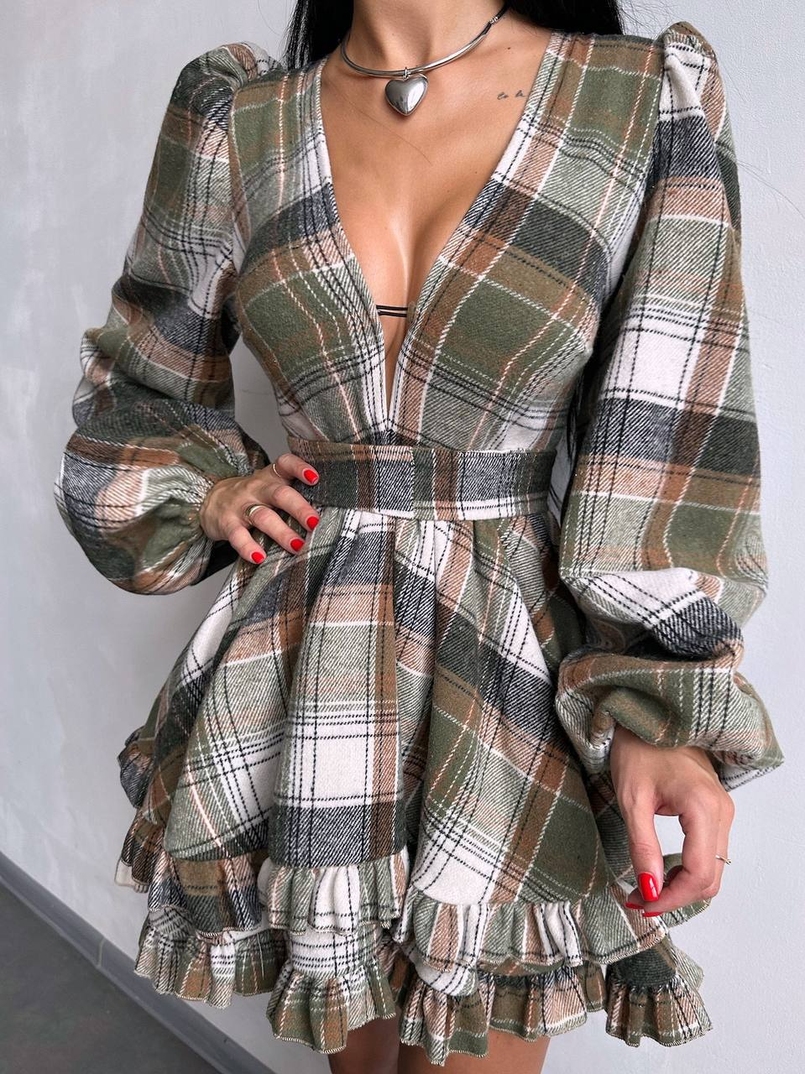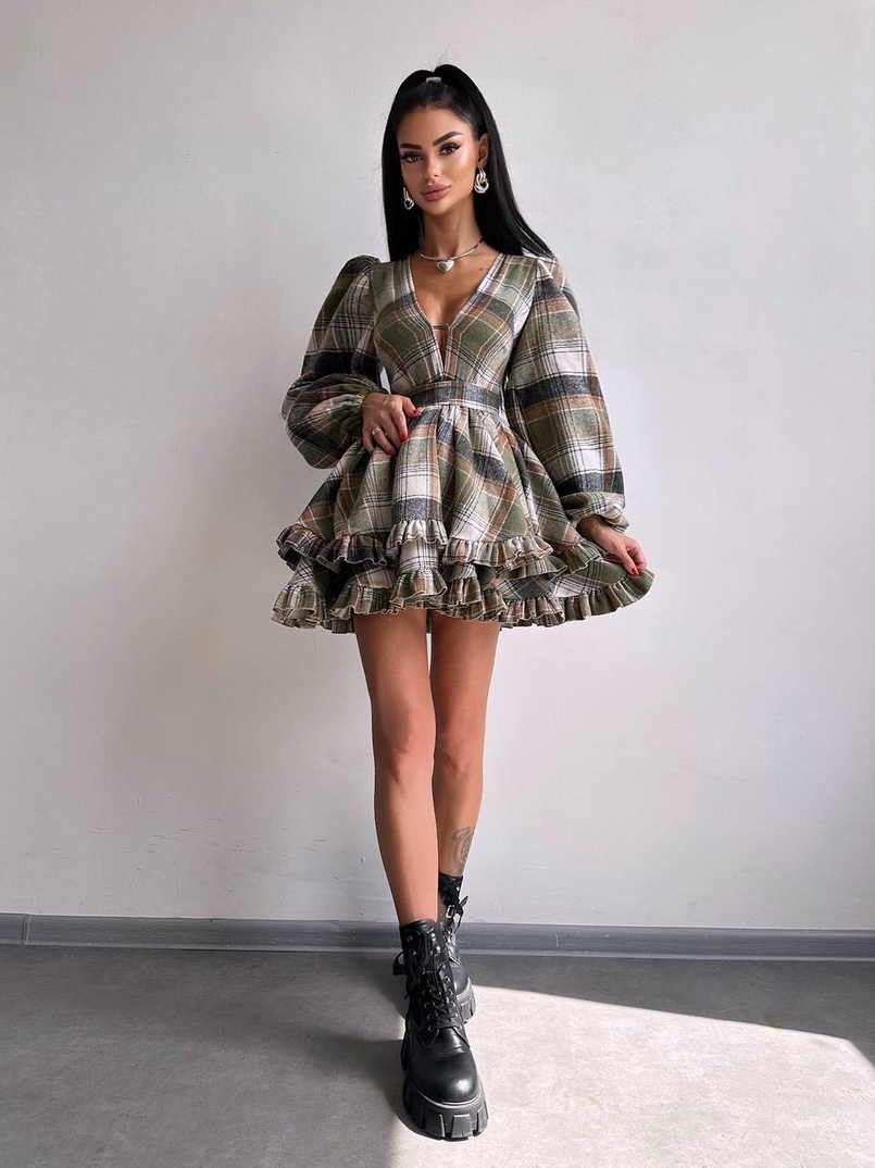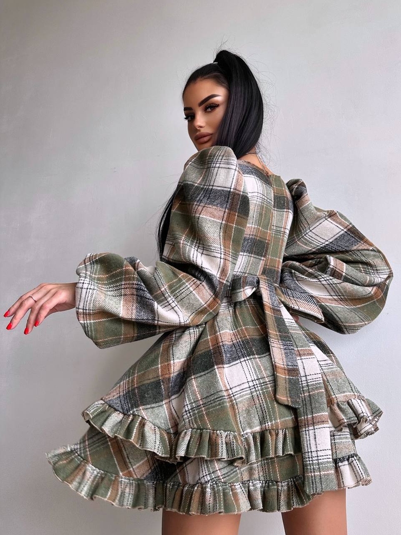 Сукня з подвійною спідницею та обʼємними рукавами у клітинку