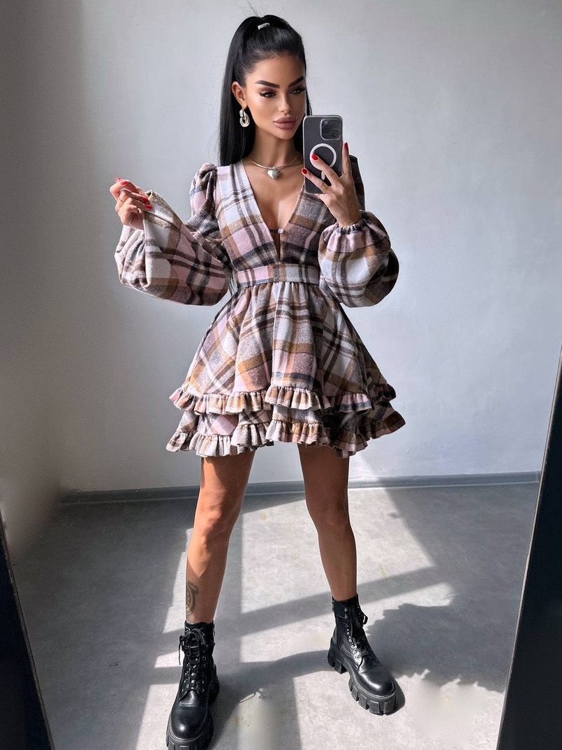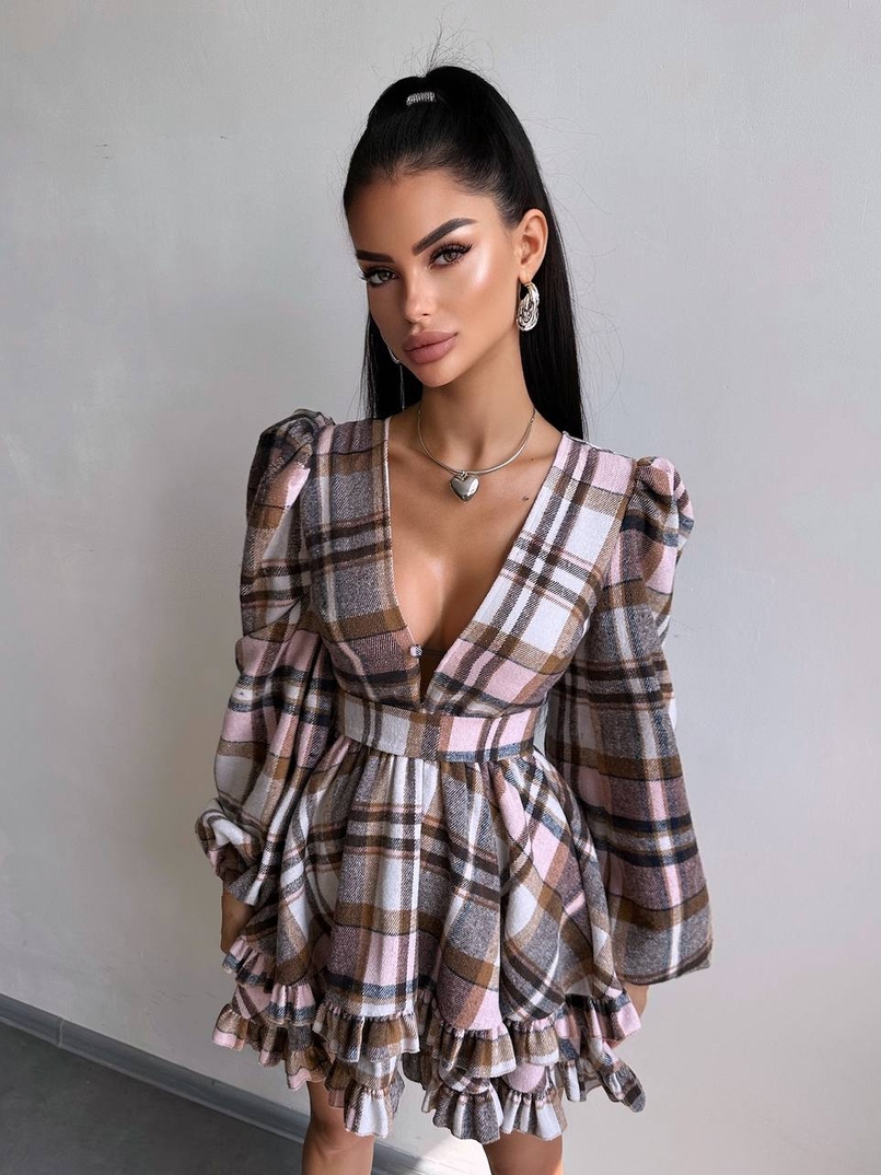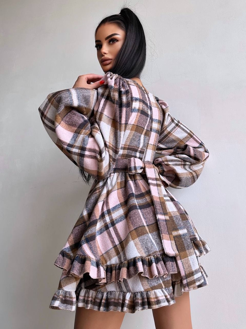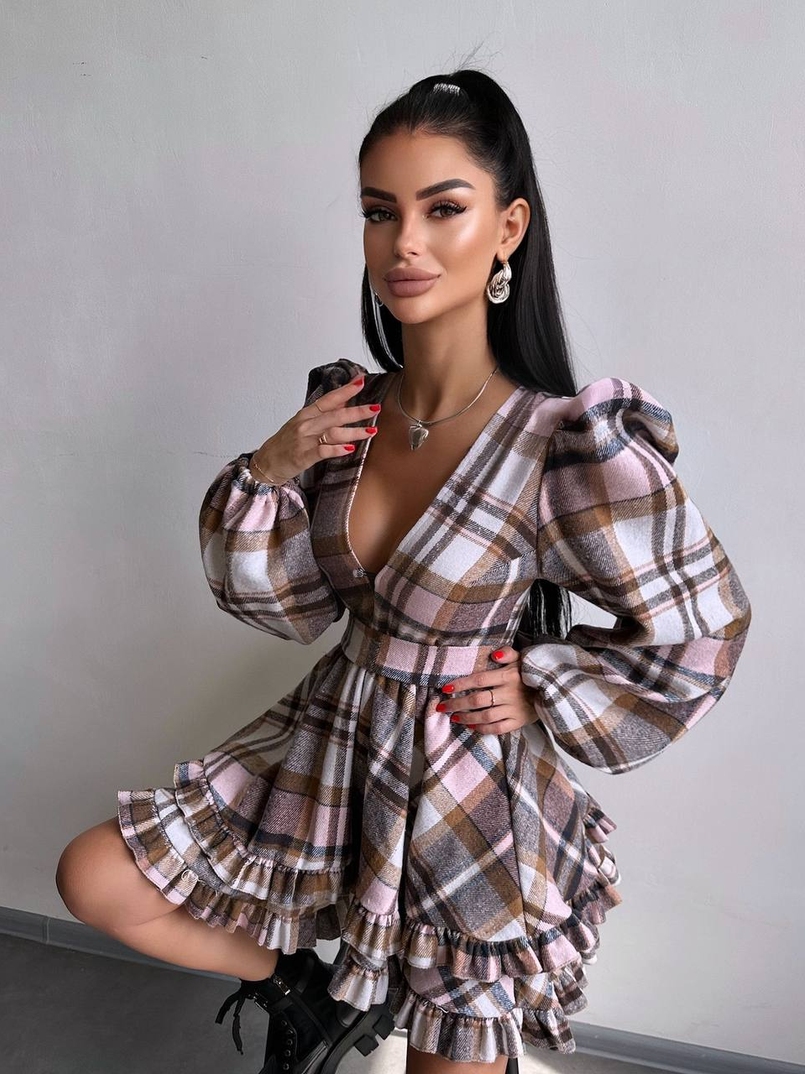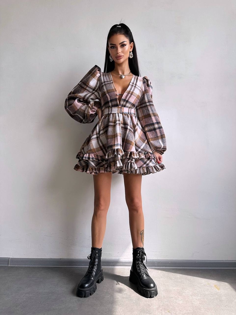 Сукня з подвійною спідницею та обʼємними рукавами у клітинку